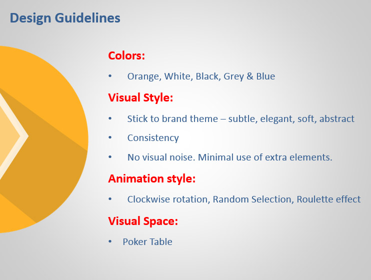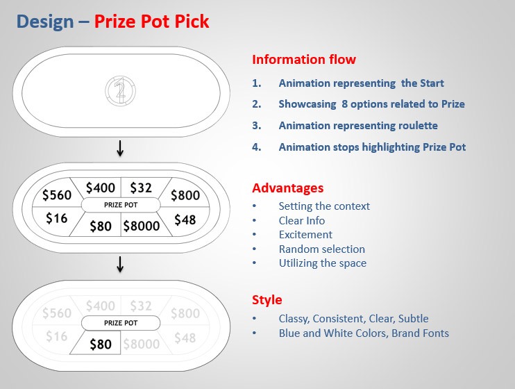 Presenting the information clearly , Preserving our uniqueness and style , Showcasing fairness and randomness , Utilizing the existing table space, Light weight visual animation
